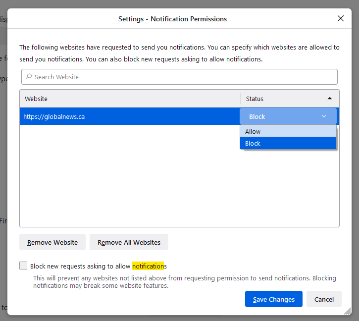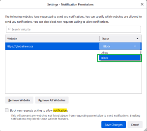 - Click on “Settings…” under notifications permissions. Locate the https://globalnews.ca entry, select “Block” to unsubscribe from receiving push notifications from globalnews.ca