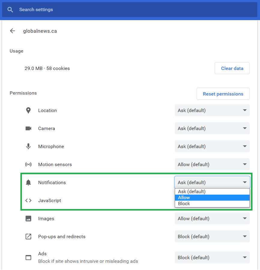 - Open site settings by copying the following and pasting into the address bar of a new tab in your browser: chrome://settings/content/siteDetails?site=https://globalnews.ca