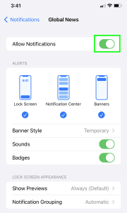 - Click on “Settings…” under notifications permissions. Locate the https://globalnews.ca entry, select “Allow” to subscribe to push notifications