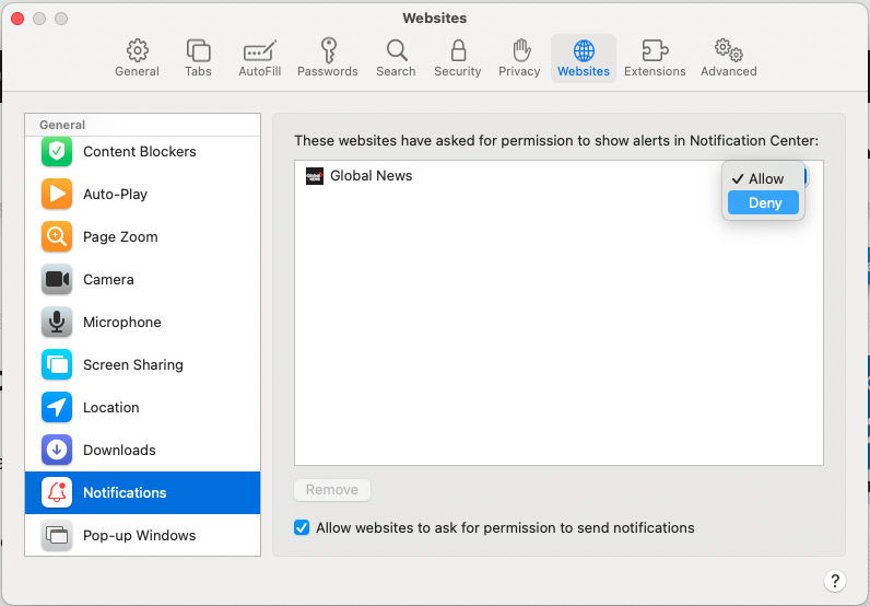 - Select “Websites” and click “Notifications“, select “Deny” for Global News to unsubscribe from receiving push notifications from globalnews.ca